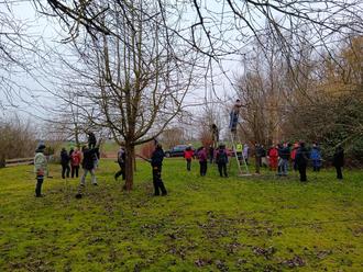 Am 8. Februar trafen sich über 30 Interessierte auf der Streuobstwiese in Neuendorf, um sich in die Geheimnisse des Obstbaumschnittes einführen zu lassen. Die gelernte Baumschulgärtnerin Anja Wehmeier und ihr Mann Stefan, der ebenfalls bei einem Gartenbaubetrieb angestellt ist, standen für alle als Ansprechpartner bereit.