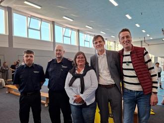 Mitglieder der Feuerwehr: Süderholz Norwin Kraft und Swen Meyer, Riesebys Bürgermeisterin Doris Rothe-Pöhls, Süderholzer Bürgermeister Alexander Benkert, Thumbys Bürgermeister Martin von Spreckelsen (v.l.)