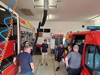 Kameraden der Feuerwehr Süderholz mit dem Ortswehrführer Jens Schiweck im Gerätehaus der Feuerwehr Rieseby