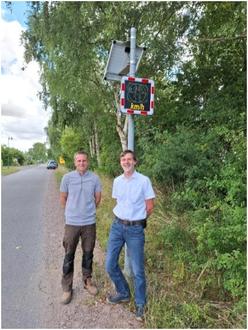 Kim Mummert von der Baltic Agrar Kandelin und Bürgermeister Alexander Benkert vor den neuen Verkehrsdisplay an der Wüsteneyer Straße
