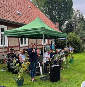 Orgel und Organist kamen an ihre Grenzen! Zeitz schloss mit einer Eigenkomposition auf den Pommernmissionar Otto von Bamberg, doch angesichts der hörbaren Mängel kürzte er das Programm in diesem Teil. Trotzdem dankte das Publikum mit anerkennendem, freundlichem Beifall, zumal Pastorin Rapraeger im Anschluss an das Konzert zu Bratwurst und Salat eingeladen hatte. Im Pfarrgarten war schon alles vorbereitet, und der Regenschauer – Gott sei Dank! – vorübergegangen, ohne dass die Gäste nass geworden waren. Einige Freiwillige, Frauen um Christine Rusch, aus der Familie Rahn u.a. hatten für Getränke und Speisen gesorgt; die Grillwurst aus Kandeliner Produktion schmeckte bestens. Dazu hatten die „Kandeliner Eintagsfliegen“ ihre Instrumente in Bereitschaft gebracht und spielten flotte Blasmusik. Kurze Ansprachen von den Ehrengästen folgten.