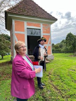 Hier, bei letzterem, fanden die Parkführungen in diesem Jahr mit Frau Brunhilde Weiß, der Vorsitzenden des Schlossvereins sowie ihrem Stellvertreter, Herrn Kurt Günther statt. Musikalisch begleitet wurden sie von Arne Berg aus Greifswald, der in barocker Kostümierung an verschiedenen Punkten im Park seine Querflöte erklingen ließ.