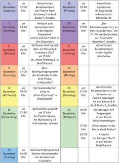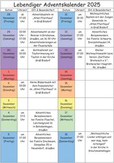 Außerdem sind alle eingeladen, sich im Advent auf den Weg zu machen und die „Adventstürchen“ zu besuchen. Hinter jedem Türchen gibt es etwas anderes zu erleben. Man kann Menschen treffen, gemütlich beisammen sein, Adventsmusik lauschen oder auch mitsingen, Geschichten hören, kreativ sein, Leckereien genießen oder auch noch Dinge für die kommende Advents- und Weihnachtszeit erwerben – also kurz gesagt, die Adventszeit gemeinsam mit verschiedenen Angeboten genießen und sich auf das bevorstehende Weihnachtsfest einstimmen. Machen Sie sich auf den Weg, hinter jedem Türchen freuen sich die Menschen über Ihren Besuch.