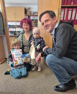 Jorah als fleißigster Hydrantenjäger nimmt mit seiner Mutter und Schwester von Bürgermeister Alexander Benkert seine Überraschung entgegen (v.l.)