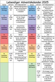 Außerdem sind alle eingeladen, sich im Advent auf den Weg zu machen und die Adventstürchen zu besuchen. Hinter jedem Türchen gibt es etwas anderes zu erleben. Man kann Menschen treffen, gemütlich beisammen sein, Adventsmusik lauschen oder auch mitsingen, Geschichten hören, kreativ sein, Leckereien genießen oder auch noch Dinge für die kommende Advents- und Weihnachtszeit erwerben, also kurz gesagt die Adventszeit gemeinsam mit verschiedenen Angeboten genießen und sich auf das bevorstehende Weihnachtsfest einzustimmen. Machen Sie sich auf den Weg, hinter jedem Türchen freuen sich die Menschen über Ihren Besuch.