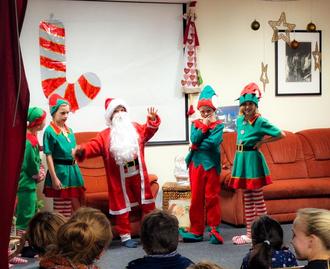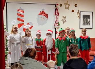 Zahlreiche Besucher ließen sich dies nicht entgehen und so war es nicht verwunderlich, dass der Schulhof am 27. November bereits um 16 Uhr gut gefüllt war, als die Kinder der Theater AG alle Anwesenden mit dem Weihnachtsklassiker „Guten Abend, schön Abend“ begrüßten, um anschließend zum Theaterstück „Weihnachten in Gefahr“ einzuladen. In der Aula konnten Schaulustige dann erleben, wie der Weihnachtsmann mit Hilfe von Wichteln und Engeln von einem hartnäckigen Schluckauf befreit werden konnte. Das Schauspiel über die Rettung von Weihnachten wurde insgesamt dreimal aufgeführt. Ein Lob und Dankeschön an unsere spielfreudigen Theaterkinder für ihr Engagement und ihren Einsatz.