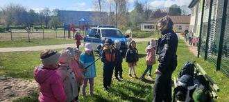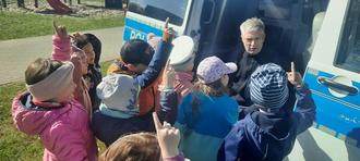 Dann ging es wieder zurück in die Kita und die Kinder wurden in zwei Gruppen eingeteilt. Die eine Gruppe unter der Anleitung von Herrn Barthel, durfte das Polizeiauto erkunden und auch mal als Chef vorne links sitzen, natürlich wurde auch das Blaulicht und das Martinshorn getestet.