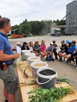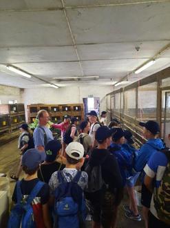 Als wir bei Fridas Haus angekommen waren, haben wir eine Frühstückspause eingelegt. Danach ist Fridas Mutter mit zum Kowalzer Landhof gekommen. Auf dem Hof haben wir Herrn Mougin und Frau Raddatz kennengelernt. Herr Mougin hat uns dann etwas über Farmpflanzen erzählt. Danach haben wir eine kleine Schnipseljagd auf dem Hof gemacht. Zuerst waren wir bei einem der Jägerhochsitze und dann bei dem 400 t schweren und riesigen Findling auf dem Hof. Nun sind wir von dem Findling zu der Reparaturgarage gegangen. Auf Weg dorthin fanden Lottie und Charly Fasanenfedern. Es gab nicht nur Fasane, sondern auch drei Pfauen, die frei herumliefen. Hinter der Garage befinden sich sechs riesige Silos. Das hintere stand leer, also durften wir einen Blick hineinwerfen und sogar hineinklettern. Wir kamen nur durch eine kleine Luke, durch die wir krabbeln mussten. Im Silo drinnen war es stockdunkel und gruselig. Auf einmal wurde es sehr laut, weil ein LKW von einem anderen Silo beladen wurde. Wir alle hatten uns sehr erschrocken. Am Ende der Schnipseljagd fanden wir den langersehnten Schatz. Im Schatz waren Süßes, Malblöcke, Capi´s und Notizblöcke. Zunächst haben wir Melone genascht. Zum Ende durften wir noch die Traktoren besichtigen und einmal auf den Fahrersitz steigen.