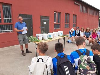 Nun sind wir zum Garten gegangen, der gleich nebenan war. Dort gab es Gemüse wie z. B. Gurken, Tomaten, Blumenkohl und Erbsenschoten. Ein paar der ersten Erbsen waren schon reif. Die durften wir probieren und die Schoten konnte man mitessen, da es Zuckerschoten waren. Wir verabschiedeten uns von Herrn Kisiel, der uns den Garten gezeigt hatte. Ein paar Kinder gingen zu Fuß nach Hause, der Rest fuhr mit dem Bus nach Tessin zur Schule zurück.