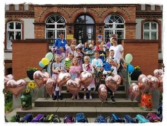 Aufgeregtes Geschnatter und viele gespannte Gesichter konnte man kurz vor 10.00 Uhr am Westtor der Camminer Kirche sehen - endlich war er für die 16 Kinder der neuen ersten Klasse soweit und die Kirchenglocken begannen zu läuten. So zogen sie feierlich mit Pastorin Froesa-Schmidt, ihrer Klassenlehrerin Frau Dr. Sievers und Bezugserzieherin Frau Wöhler in die Kirche ein und nahmen auf bunt geschmückten Stühlen platz. Alle Schüler und Mitarbeiter der Storchenschule haben zur Begrüßung der ABC-Schützlinge schon vor den Sommerferien das Lied „Seid willkommen, herzlich willkommen“ auf Video aufgenommen. Nach den Worten der Pastorin und der Schulleitung wurden die Kinder dann gesegnet und mit dem Kindermutmachlied auf ihre Schulzeit eingestimmt.