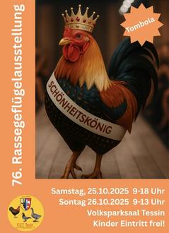 Der Rassegeflügelzüchterverein Tessin „Am Prangenberg“ e.V. lädt herzlich zur traditionellen Rassegeflügelausstellung am Wochenende des 25. und 26. Oktober 2025 in den Volksparksaal Tessin ein. Am Samstag sind die Türen von 9 bis 18 Uhr, am Sonntag von 9 bis 13 Uhr geöffnet.