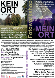 Die Ausstellungseröffnung mit euch und euren Fotos findet am 27.6.2026 im Treffpunkt Freizeit in Potsdam statt. Sie ist der Abschluss einer Workshopreihe im Rahmen von Kulturland Brandenburg „Von hier aus Zukunft“ 2026.