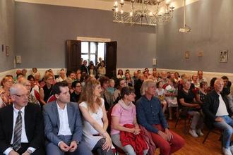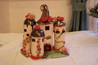 Anschließend durften die Gäste die Gemälde und Plastiken bestaunen, die Studierende der Universität Kiel und die Kinder der Kinderkeramik-AG des KHV Groß Lüsewitz unter Leitung von Katrin Ulrich in den Räumen des Schlosses ausstellten. Anlässlich des 125. Schlossjubiläums wurde schließlich auch das Prunkstück der Kinderkeramik AG, ein verspieltes Dornröschenschloss aus Ton, für märchenhafte 200 EUR versteigert. Der Erlös kommt der Kinder-Keramik AG zu Gute.