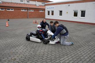 Beim Training auf dem Sanitzer Gelände lernt Kris Leon (im Kart) nicht nur Präzision, sondern auch den wertvollen Umgang mit seinen älteren Teamkollegen und Trainer.