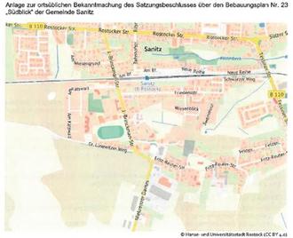 Jedermann kann die Satzung über den Bebauungsplan Nr. 23 und die Begründung dazu im Rathaus, Bau- und Ordnungsverwaltung, Zi. 2.4, Rostocker Straße 19, 18190 Sanitz, während der Dienst- und Öffnungszeiten sowie im Internet unter www.gemeinde-sanitz.de einsehen und über den Inhalt Auskunft verlangen.