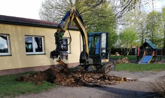 Mit technischer Unterstützung entfernten sie viele alte Baumstümpfe. Die entstandenen Löcher wurden anschließend mit Erde und die Sandkisten mit neuem Sand aufgefüllt. Des Weiteren pflanzten die Eltern noch fehlende Heckenpflanzen als Schutz zum angrenzenden zukünftigen Wohngebiet. Wir bedanken uns recht herzlich bei den Firmen Kompost & Erden OHG, der Baumschule und Grünanlagenbau „Obstblüte“ Sanitz e.G. sowie bei Outdoor Design GmbH, für die großherzige Unterstützung. Ein weiterer Dank gilt allen fleißigen Helfern.