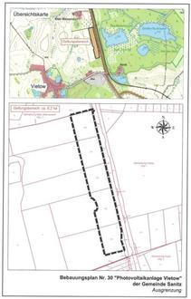 Die Gemeindevertretung der Gemeinde Sanitz hat in öffentlicher Sitzung am 05.03.2024 den Vorentwurf des Bebauungsplans Nr. 30 „Photovoltaikanlage Vietow“ gebilligt und zur Veröffentlichung im Internet bestimmt.