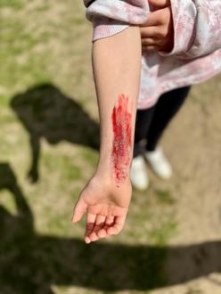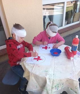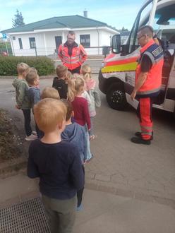 Zum Welt-Rot-Kreuz-Tag am 8. Mai war bei uns im Kindergarten und Hort wieder eine Menge los. Neben einem Besuch in der Teddyklinik und vielen spielerischen Elementen rund um das DRK gab es auch ein großes Rettungsprogramm. Die jungen Helferinnen und Helfer durften am und im Rettungswagen der Kollegen aus der DRK Rettungswache Tessin „echte“ Wunden versorgen, Verbände an Hand und Kopf anlegen, sowie Körperfunktionen messen.