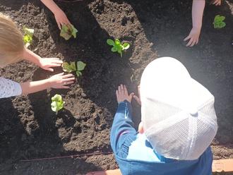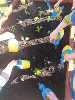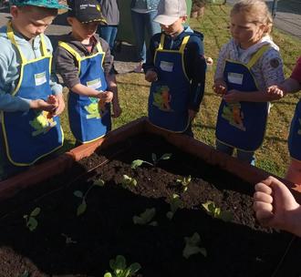 Mit Gärtnerschürzen und hochgekrempelten Ärmeln startete die Pflanzaktion. Zuerst wurden Düngerchips in der neuen Erde versteckt, dann durfte jedes Kind Salat-, Kohlrabi- oder Rote Beete Pflänzchen vorsichtig in das Hochbeet setzen. Unterstützung hatten die Kinder dabei von Mandy und Janne, den großen Gemüseprofis. Anschließend säten die Kinder Radieschen und Möhren ein. Zum Schluss wurde das gepflanzte Gemüse vorsichtig angedrückt und gegossen.