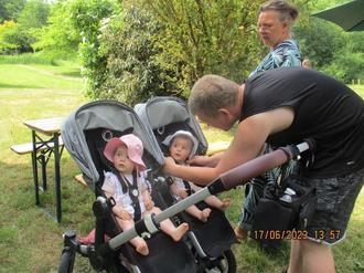 Die große Wiese am Kirchsteig bunt geschmückt, Tische, Bänke und große Decken für die Krabbelkinder mit den Muttis und - wie in jedem Jahr- das tolle Kuchenbuffet mit Saft und Wasser. Diana mit ihrem flotten Hütchen begrüßte die fleißigen Mitarbeiterinnen der Gemeinde per Handschlag. Gute Beziehungen zur Versorgungsstelle schaden nie. Thea und Mara kamen im Doppelpack, wie auch Merle und Milo. Der Fuhrpark auf unserer Wiese war interessant und benötigte eine beachtliche Stellfläche. Lars kam zum mir mit einer Bitte: „Ich habe hier auch einen Baum. Kannst Du ihn mir zeigen?“ Das war eine echte Herausforderung. „Ich bin jetzt 6 Jahre alt und mein Baum auch.“ Eine große Hilfe, die er mir gab, denn das vor 6 Jahren gepflanzte Bäumchen fanden wir als einen inzwischen stattlichen Baum. Die Übergabe unserer Urkunden lief reibungslos, wenn auch mit kleinen Hürden. Mal schlief die Hauptperson oder sie war gerade an der privaten „Tankstelle“ angelegt. In dieser Runde gab es vollstes Verständnis. Interessant wurde es, wenn der Bart des Bürgermeisters mit dem vom Papa doch gewisse Ähnlichkeiten zeigte. Die kleinen Persönlichkeiten stellten aber sehr schnell ihre Ordnung wieder her. Auf den großen Decken reger Austausch der Mütter. War doch vielen klar, wir treffen uns in Krippe, Kita und Schule wieder. Ja, liebe Grundschule Sanitz: zur Einschulung im Jahr 2028/2029 gibt es die stattliche Zahl von 60 plus x erwartungsfrohen Kindern …