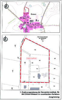 Für den in der beiliegenden Übersichtskarte gekennzeichneten Geltungsbereich im Bereich der Flurstücke 192, 193, 194, 195, 196/1, 197 (tlw.) und 198, Flur 1, Gemarkung Breesen bei Böhlendorf, hat die Gemeindevertretung der Gemeinde Lindholz in der Sitzung am 28.09.2023 die Aufstellung der 1. Ergänzungssatzung der Gemeinde Lindholz für den Ortsteil Breesen beschlossen. Der Aufstellungsbeschluss wird hiermit gemäß § 2 Abs. 1 BauGB ortsüblich bekannt gemacht.