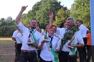 Weiter ging es zu unserem Bürgermeister, Stefan Schmidt dieser empfing uns freundlich mit einem kleinen Schnäpschen und fuhr dann auf dem Kremser, der von dem Traktor der Familie Bernhard Günther gezogen wurde, mit zum Festplatz. Ebenfalls am Festumzug beteiligt war ein Fahrzeug der freiwilligen Feuerwehr Dettmannsdorf, was uns sehr gefreut hat. Wieder am Festplatz angekommen, wurde die Tonne gerichtet, die Reiter und die Zuschauer begrüßt und dann ging es auch schon los. Als Juliane Schlicker das letzte Stückchen des Bodens rausschlug hatten wir eine neue Bodenkönigin. Der Stäbenkönig wurde in diesem Jahr, und das freut uns besonders, ein Reiter aus unserem Dorf, der noch dazu das erste Mal an solch einem Event, als aktiver Reiter teilnahm, Jost Hagemeister. Reinhard Jacob (ältester Reiter) wurde verdient Tonnenkönig. Herzlichen Glückwunsch den drei Königen.