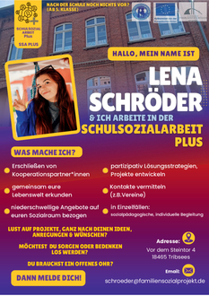 Ich heiße Lena Schröder und arbeite in der sozialraumorientierten Schulsozialarbeit in Tribsees. In meiner Rolle als Sozialpädagogin gestalte ich spannende Projekte für Schüler*innen ab der 5. Klasse, die ganz nach ihren Ideen und Wünschen entwickelt werden.