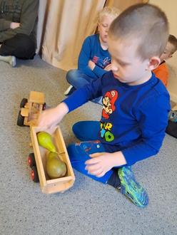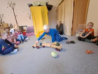 Er hatte verschiedene Früchte auf seinem Feld und brauchte Hilfe bei der Ernte. Mit Unterstützung der Kinder waren alle schnell vom Feld geholt und in die Scheune gebrachte worden. Dabei benannten die Kinder alles, was geerntet wurde.