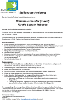 Das Amt Recknitz-Trebeltal beabsichtigt ab sofort einen Schulhausmeister (m/w/d) für die Schule Tribsees befristet als Krankheitsvertretung einzustellen.