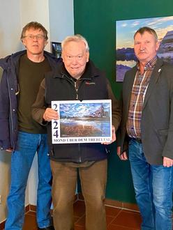 Der ARBEITSKREIS ASYL der evangelischen Kirchengemeinde bietet ein ganz besondres Geschenk zu Weihnachten und zum neuen Jahr an: Heiko Kauffmann vom AK ASYL konnte Bürgermeister Bernhard Zieris und Pastor Detlef Huckfeldt jetzt das erste Exemplar des Kalenders „Mond über dem Trebeltal“ überreichen.