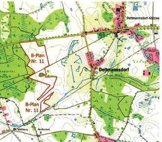 Die Gemeindevertretung der Gemeinde Dettmannsdorf hat in ihrer öffentlichen Sitzung am 04.11.2025 beschlossen, für das Plangebiet im Westen des Gemeindegebiets, westlich der Ortslage Dettmannsdorf, an der Gemeindegrenze zur Gemeinde Stubbendorf, auf Teilen der Flurstücke 26 - 33 und 82/4 der Flur 1 der Gemarkung Dettmannsdorf sowie der Flurstücke 22 - 26, 29, 62/2, 64/1, 65, 66, 78 - 84, 89 - 96 und 116/2 der Flur 2 der Gemarkung Dettmannsdorf den Bebauungsplan Nr. 11 Sondergebiet „Erneuerbare Energien Süd, westlich von Dettmannsdorf“ der Gemeinde Dettmannsdorf aufzustellen.