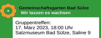 Auch uns geht das so, deswegen gründen wir einen Gemeinschafts-garten und freuen uns gemeinschaftlich das Jahr zu gestalten. Am 17. März 2023 treffen wir uns dafür wieder im Salzmuseum Bad Sülze. Wir freuen uns auf ein nettes Beisammensein und freuen uns auf jeden der gerne mitmachen möchte. Kommt vorbei und gestaltet mit. Mehr Informationen erhaltet Ihr gerne unter geimsam_bad_suelze@posteo.de oder 0176-23725277.