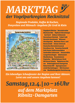 Am Samstag, den 12.04.2025 erhalten Einheimische und Gäste die Möglichkeit, auf einen Schlag zu erkunden, was die Vogelparkregion Recknitztal alles zu bieten hat. An diesem Markttag auf dem Markt in Ribnitz-Damgarten können Besucher zwischen 10 und 16 Uhr mit den vielfältigen Anbietern der Umgebung ins Gespräch kommen.
