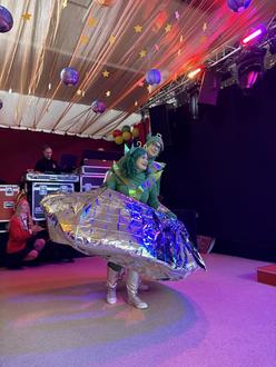 Den Auftakt der ersten Szene gestalteten die Tanzmäuse mit ihrem Showtanz. Mit strahlenden Gesichtern und einer beeindruckenden Choreografie eroberten sie im Nu als Sterne die Herzen der Zuschauer. Ihr Auftritt blieb auch im Weltall nicht unbemerkt: Die beiden neugierigen Aliens Neil und Lissy wurden auf das bunte Treiben aufmerksam und zeigten sich sichtlich begeistert.