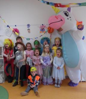 Zum krönenden Abschluss zog eine lange Polonaise durch das gesamte Haus. Dabei durften die Kinder einmal so richtig Krach machen. Mit Trommeln, Triangeln, Pfeifen und anderen Instrumenten begleiteten sie den bunten Umzug lautstark durch das Haus. Überall wurde gelacht und musiziert. Am Ende des Tages waren alle erschöpft aber überglücklich. Ein rundum gelungener und aufregender Faschingstag ging zu Ende.