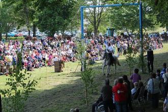Begrüßung durch den Bürgermeister Herrn Bernhard Zieris am Rathaus Tribsees, dann Umzug aller teilnehmenden Reiter zusammen mit der Feuerwehrkapelle vom Rathaus bis zum Volkspark.