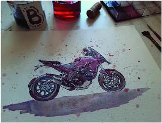 Die Rotweinmalerei ähnelt dem Aquarell und wird u. a. auch mit Rote-Beete-Saft und Kaffee ausgeführt. Diese nachhaltige Malweise mit Naturfarben nennt man Biopainting. Der verwendete Rotwein sind Reste aus einem Weindepot in Rostock. Ergänzend kommen noch diverse Stiftarten sowie Maskiergummi hinzu.