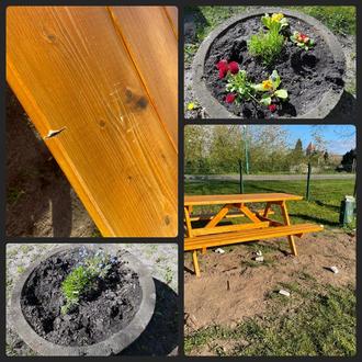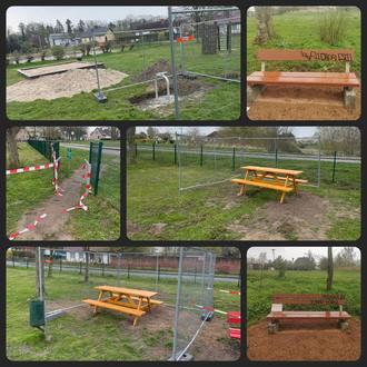 Zum Schutz der neu eingebauten Gegenstände sind diese durch Bauzäune gesichert worden. Der Beton sollte Gelegenheit haben, vollständig auszuhärten. Weder Absperrband noch Zäune hielten „Idioten“ davon ab, direkt nach dem Einbau, ihr Unwesen auf dem Platz zu treiben. Bauzaunfelder und Füße wurden noch in der Nacht nach dem Subbotnik gestohlen, die neuen Bänke und Tische wurden zerkratzt und Schnitte mit einer Säge ausgeführt – Warum? Ist es denn alles so wenig Wert, dass man damit nicht vernünftig umgeht? Die Helfer haben ihre Freizeit und viel Kraft aufgewendet, um den Platz für alle Kinder herzurichten und ihnen schöne Momente des gemeinsamen Spiels zu ermöglichen. Wen stört das? Warum sind die Nutzer des Spielplatzes darüber hinaus nicht in der Lage ihren Müll in die vorhandenen Mülleimer zu werfen. Die neuen Tisch-Sitz-Kombinationen sind extra in die Nähe der Eimer gestellt worden und dennoch liegt der Dreck und Müll um die Bänke herum. Fühlen sich die Menschen in diesem Dreck wohl? Glücklicherweise gibt es auch andere, wie zum Beispiel Jugendliche, die den Müll aufsammeln und wegwerfen, obwohl er nicht von ihnen stammte – ein kleiner Lichtblick!