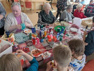 Während des Malens und Klebens entstanden auch kleine Unterhaltungen an den Tischen zwischen den Kindern und den Bewohnern, Ideen wurden untereinander ausgetauscht.