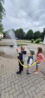 Bei einer praktischen Übung durften die Kinder sogar selbst unter Anleitung einen kleinen Brand löschen. Diese Erfahrung vermittelte ihnen spielerisch wichtige Kenntnisse über den Umgang mit Feuer und die Bedeutung von Brandschutz.