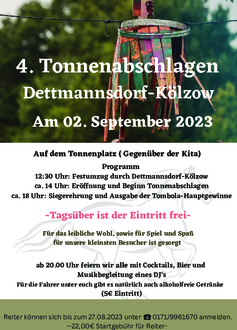 Am 02. September 2023 heißt es wieder: Mähne richten, Sattel aufs Pferd und los geht es nach Dettmannsdorf-Kölzow, wo dieses Jahr das 4. Tonnenabschlagen stattfindet. Wir laden alle recht herzlich ab 12:30 Uhr zum Festumzug durch Kölzow ein und würden uns sehr freuen, wenn wir auf feierlich geschmückte Gärten schauen können.