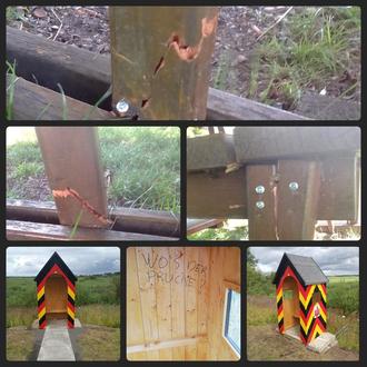 Aber auch die Schutzhütte am Wehr (Kanal) wurde mutwillig mit roher Gewalt zerstört. Eine Reparatur vor Ort ist nicht möglich. Ich werde sie zum Strukturförderverein bringen lassen, um eine eventuelle Reparatur zu prüfen. Auch hier verstehe ich nicht, welche Idioten gegen die Hölzer treten mussten. Selbstverständlich ist Anzeige erstattet. Vielleicht kann jemand zweckdienliche Hinweise geben und ruft mich unter meiner bekannten Telefonnummer an oder kommt persönlich bei mir vorbei.