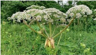Zwei- bis mehrjährige, krautige und von Juli bis September blühende Pflanze - die sogenannte Herkulesstaude, die aber keine Staude ist, auch als Riesenbärenklau bekannt. Ursprungsregion: Kaukasus. Wegen ihrer Größe (bis 3,50 m) und der großen weißen Dolde ist sie zwar schön anzusehen, aber auch giftig. Seit einigen Jahrzehnten breitet sich die Staude mit den weißen Doldenblüten rasant aus. Gute Bedingungen findet sie auf Brachflächen und an Uferrandstreifen.