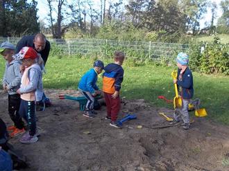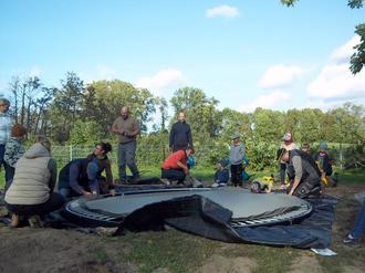 Nach dem Motto „Viele Hände, schnelles Ende“ trafen sich am vergangenen Mittwoch viele Eltern mit ihren Kindern, mit Spaten, Schaufeln und guter Laune im Außengelände der Kita. Geplant war das neue Bodentrampolin einzubauen. Ein Papa hatte schon im Vorfeld mit dem Bagger ein großes Loch gegraben. Mit Hilfe vom Handy konnte auch die dänische Aufbauanleitung gelesen werden. So wurde gegraben, geschraubt und das große Netz gespannt. Nach gut 1 1/2 Stunden war schon alles erledigt.