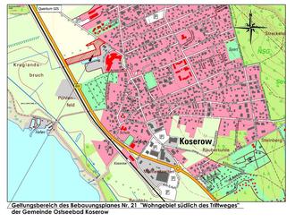 Zur Schaffung der konkreten bauplanungsrechtlichen Zulässigkeit der Vorhaben im Allgemeinen Wohngebiet wird zusätzlich eine verbindliche Bauleitplanung erforderlich. Die Gemeindevertretung des Ostseebades Koserow hat daher mit Beschluss vom 18.07.2022 das Verfahren zur Aufstellung des Bebauungsplanes Nr. 21 „Wohngebiet südlich des Triftweges“ eingeleitet. Als städtebauliche Zielsetzung wird die Entwicklung eines Allgemeinen Wohngebietes gemäß § 4 BauNVO festgesetzt. Gemäß dem städtebaulichen Konzept ist die Bildung von 9 Grundstücken vorgesehen, auf denen eine Mehrfamilienhausbebauung erfolgen soll. Das Hauptaugenmerk liegt auf der Ausweisung von Flächen für besonders stark nachgefragte Wohnformen wie barrierearme Wohnungen, kleine Wohnungen für Angestellte von Beherbergungseinrichtungen und größere Wohnungen für Familien mit Kindern. Die Kapazität des Plangebietes wird mit maximal 67 Wohneinheiten prognostiziert.