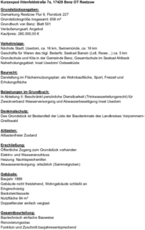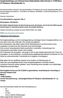 Die Gemeinde Benz verkauft in der Gemeinde Benz OT Reetzow das mit der Doppelhaushälfte (Alte Schule) bebaute Grundstück in 17429 Benz OT Reetzow, Ihlenfeldstr. 7a-Gemarkung Reetzow, Flur 9, Flurstück 227.
