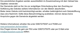 Der Gemeinde steht es frei, bis zur endgültigen Entscheidung über den Zuschlag zur Aufklärung des Gebotes weitere Informationen von den Bietern abzufordern. Bieter deren Gebote nicht berücksichtigt werden, erhalten baldmöglichst nach Gebotsöffnung dazu eine Nachricht. Sollte diese Benachrichtigung ausbleiben, können daraus keine Ansprüche gegen die Gemeinde abgeleitet werden.