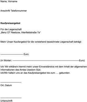 Dafür kann das beigefügte Muster eines Kaufpreisangebotes verwendet werden. Juristische Personen werden gebeten, Ihrem Kaufantrag einen aktuellen und vollständigen Registerauszug beizufügen.