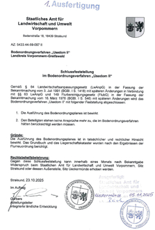 Gegen diese Schlussfeststellung kann innerhalb eines Monats nach Bekanntgabe Widerspruch beim Staatlichen Amt für Landwirtschaft und Umwelt Vorpommern, Sitz Stralsund oder dessen Außenstelle, Sitz Ueckermünde erhoben werden.