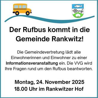 Die Gemeindevertretung lädt alle Einwohnerinnen und Einwohner zu einer Informationsveranstaltung am 24. November 2025, 18.00 Uhr in den Rankwitzer Hof in Rankwitz ein. Die VVG wird dort alle Fragen rund um das neue Angebot beantworten.